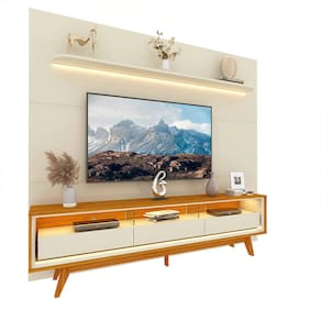 Um conjunto perfeito para sua casa. Com luz LED em cor quente, o painel Royal com rack Requinte, vão trazer para a decoração um toque de aconchego e elegância. O painel em 100% MDF possui prateleira de cantos curvos e bordas laqueadas e três veios decorativos. O rack com três gavetas espaçosas de design flutuante e divisórias em vidro 8mm. Esta dupla foi pensada para você e seu lar.