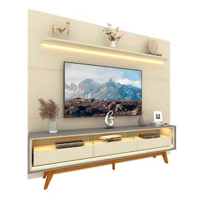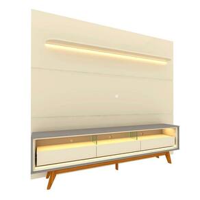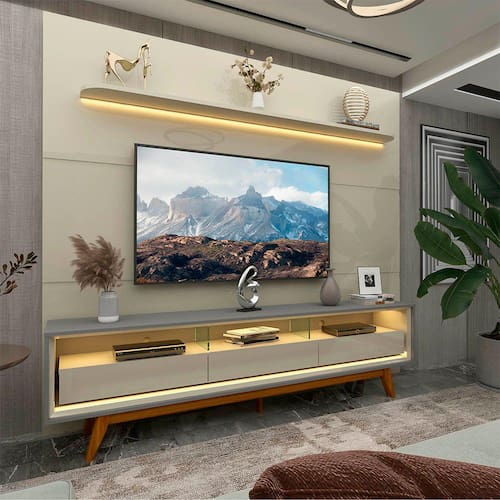 Um conjunto perfeito para sua casa. Com luz LED em cor quente, o painel Royal com rack Requinte, vão trazer para a decoração um toque de aconchego e elegância. O painel em 100% MDF possui prateleira de cantos curvos e bordas laqueadas e três veios decorativos. O rack com três gavetas espaçosas de design flutuante e divisórias em vidro 8mm. Esta dupla foi pensada para você e seu lar.
