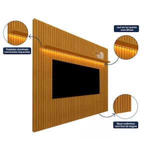 RACK REQUINTE 172 E PAINEL NOBRE 185O conjunto Rack e Painel é a peça ideal para quem deseja modernidade e sofisticação em sua sala de estar. O painel conta uma linda prateleira chanfrada com bordas laqueadas, o complemento possibilita duas opções de montagem, sendo elas na parte superior e inferior do produto, com LED em luz quente com difusor e ripas autênticas. Já o Rack contém LED em luz quente com difusor na parte superior e inferior do nicho, o item proporciona sensação de aconchego para o seu ambiente, com bordas chanfradas e laqueadas, o nicho também conta com divisória em vidro de 8mm, gavetas chanfradas com bordas laqueadas e rodízios. **PRODUTO COM RIPA DE VERDADE!**PAINELAltura: 2500mmComprimento: 1840mmProfundidade: 246mmCaracterísticas:- 100% MDF- Design moderno- Painel com ripas autênticas- LED em luz quente com difusor- Suporta TV's de até 75''- Prateleira chanfrada com bordas laqueadas- Prateleira decorativa com duas opções de encaixe, superior e inferior RACK Altura: 450mmComprimento: 1725mmProfundidade: 348mmCaracterísticas:- Duas gavetas chanfradas com bordas laqueadas e corrediças telescópicas- LED em luz quente com difusor na parte inferior e superior do nicho- Prateleira chanfrada com bordas laqueadas- Produto com acabamento atóxico- Divisória em vidro de 8mm- Suporta TV's de até 70''- Material: MDF/MDP- Rodízios OBSERVAÇÕES:*Imagens meramente ilustrativas. A cor pode variar de acordo com a iluminação do ambiente.*Itens de decoração não inclusos.*Montagem não inclusa.
