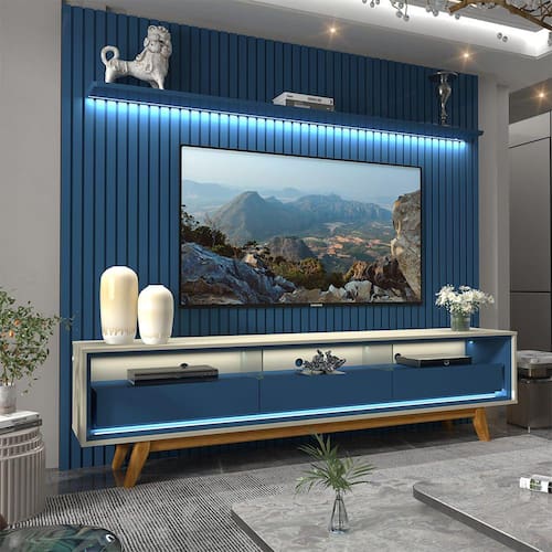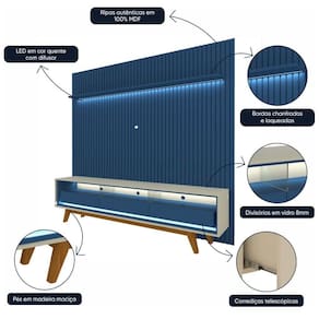 O conjunto Rack e Painel é a peça ideal para quem deseja modernidade e sofisticação em sua sala de estar. O painel conta uma linda prateleira chanfrada com bordas laqueadas, o complemento possibilita duas opções de montagem, sendo elas na parte superior e inferior do produto, com LED em luz quente com difusor e ripas autênticas. Já o Rack contém LED em luz quente com difusor na parte superior e inferior do nicho, o item proporciona sensação de aconchego para o seu ambiente, com bordas chanfradas e laqueadas, o nicho também conta com divisórias em vidro de 8mm, gavetas chanfradas com bordas laqueadas e pés em madeira maciça com detalhes abaulados.