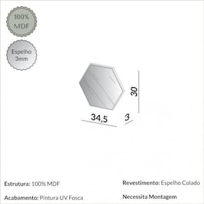 A peça é produzida 100% em MDF, com pintura de 6 camadas de proteção, o que confere alta qualidade de acabamento. O ES1 possui formato hexagonal e é uma peça chave para qualquer ambiente. Com proporções coringas, o espelho é destaque para qualquer ambiente e confere um design elegante para completar a decoração com exclusividade e personalidade.