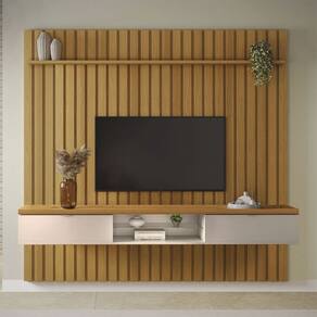 Com acabamento em Impressão UV Texturizada, o painel na cor Cinamomo oferece um toque aconchegante e sofisticado. Sua bancada robusta, com tampo de 40mm e prateleira de vidro 6mm, proporciona um visual moderno e organização eficiente para seus eletrônicos e objetos decorativos. As portas basculantes com puxadores de alumínio na cor champanhe agregam um charme extra ao ambiente.
