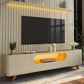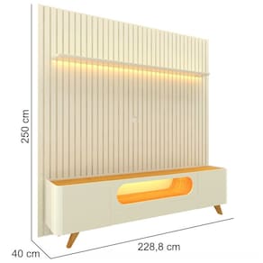 Estrutura: MDFAcabamento: Pintura U.V. não atóxicoPorta: Sim, com dobradiças “SLOW MOTION”Gaveta: Sim, com corrediças telescópicasPrateleira: Sim, com bordas chanfradas e laqueadasNicho: Sim, no rack nicho curvoLED: Sim, em cor quente com difusorPés: Sim, em madeira maciçaDiferencial: Veios decorativos de 42 mm; Rack com cantos e nicho curvosDimensões do produto montado