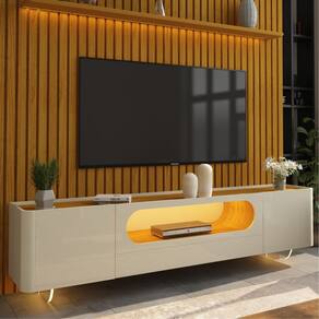 Estrutura: MDFAcabamento: Pintura U.V. não atóxicoPorta: Sim, com dobradiças “SLOW MOTION”Gaveta: Sim, com corrediças telescópicasPrateleira: Sim, com bordas chanfradas e laqueadasNicho: Sim, no rack nicho curvoLED: Sim, em cor quente com difusorPés: Sim, em vidro com LEDDiferencial: Veios decorativos de 42 mm; Rack com cantos e nicho curvosDimensões do produto montado