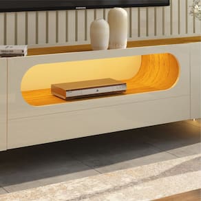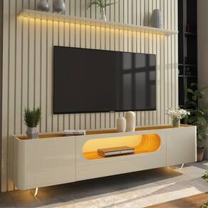 Estrutura: MDFAcabamento: Pintura U.V. não atóxico Porta: Sim, com dobradiças “SLOW MOTION” Gaveta: Sim, com corrediças telescópicas Prateleira: Sim, com bordas chanfradas e laqueadasNicho: Sim, no rack nicho curvoLED: Sim, em cor quente com difusor Pés: Sim, em vidro com LEDDiferencial: Veios decorativos de 42 mm; Rack com cantos e nicho curvosDimensões do produto montado