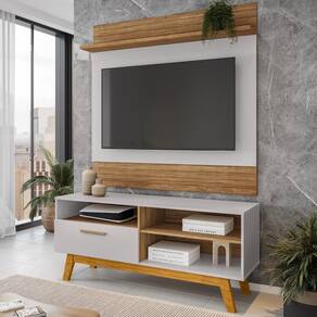 Painel Suspenso Guarujá e Rack Bancada Paládio, conjunto moderno que alia praticidade e estilo para sua sala. Estrutura em MDP/MDF com acabamento em pintura UV texturizada. Conta com frisos decorativos em baixo relevo, painéis sobrepostos (MDF 15mm), prateleira superior (MDP 25mm), porta basculante com dobradiças metálicas, puxador revestido em MDF, nichos funcionais, passa fios e pés em madeira maciça (Pinus). Suporta TVs de até 55 polegadas. Este produto será entregue em 2 volumes.