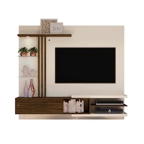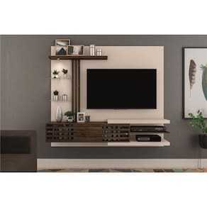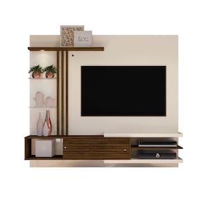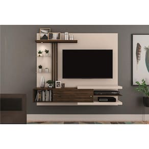 Com amplo espaço para os seus aparelhos eletrônicos, esse belo painel também possui portas deslizantes frisadas que se sobrepõem, prateleiras de vidro com 5 mm para objetos decorativos e luminária de LED para que o local tenha uma iluminação mais charmosa.