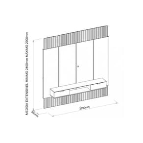 Imagens Meramente Ilustrativas. Não nos responsabilizamos pela montagem/instalação dos produtos. Todas as informações divulgadas são de responsabilidade exclusiva do fabricante/fornecedor. Ideal para TVs até (Polegadas): 75 | Garantia: 3 meses | Nossa Avaliação: Qualidade Excelente | Quantidade de Gavetas: 2 Gavetas | Garantia Legal de Fábrica CDC em Meses: 3 | Possui Garantia Complementar de Fábrica após Prazo Legal?: Garantia de Fábrica | Formato do Móvel de TV: Rack com Painel | Possui Nichos?: Sim | Necessita Montagem?: Sim | Acompanha Manual de Instalação e Montagem?: Sim | É Lavável?: Não | É resistente à água: Não | Com compartimento para alto-falantes: Não | Material das alças: Metal | Material das gavetas: MDF | Tamanho máximo de TV: N/A | Tipo de Produto: N/A | Material de Estrutura: Estrutura em MDF | Necessita Montagem: Sim | Acompanha Lâmpada?: Sim | Possui Rodízios?: Não | Possui Abertura Passa Cabos: Sim | Recomendações de Uso: Instruções de Cuidado | Tipo de Pintura: UV | Tipo de Acabamento da Pintura: Pintura Semi Brilho | Tipo de Dobradiças: Dobradiças Metálicas | Quantidade de nichos: 1 Nicho | Certificação de Qualidade: Qualidade Aprovada | Estilo do Móvel: Moderno | Tipo de Acabamento: Acabamento Ripado Alto Padrão | Tipo de Iluminação: Iluminação Fita LED | Tipo de Gaveta: Gaveta Externa | Montagem do Produto: Desmontável | Sistema de Montagem: Acompanha Manual de Instalação e Montagem | Possui Designer Moderno com Apliques?: Sim | É Conjunto?: Não | Possui Pés?: Não | Possui Sapatas Niveladoras?: Não | Possui Rodapé?: Não | Possui Portas?: Não | Possui Trilho de Porta de Correr?: Não | Possui Gavetas?: Sim | Possui Corrediça Metálica que Proporciona Abertura Total das Gavetas?: Não | Possui Gavetas com Fecho de Toque para Abertura?: Não | Possui Organizador de Gaveta?: Não | Possui Prateleiras?: Não | Possui Iluminação?: Sim | Possui iluminação de LED interna com Acendimento automático?: Não | Possui Suporte de TV Universal?: Não | Necessita fixação na parede?: Sim | Pode ser Montado e Desmontado?: Sim | Possui Opção de Montagem das Portas Dupla Face?: Não | Tipo de Ambiente: Sala de Estar | Complexidade da Montagem: Media | Garantia Legal de Fábrica CDC em Dias: 90 Dias | Com rodas?: Não | Tipo de Formato: Quadrado | Código universal de produto (GTIN): 7908365528654 | Produto precisa de Montagem?: Sim, a montagem é simples mas sugerimos a contratação do nosso serviço de montagem (para os CEPs em que o serviço está disponível) ou de algum experiente de sua preferência | Descrição do Tamanho: 290.00x:229.00x36.00 cm | Estado de Origem: RJ | País de origem: Nacional | Peso Produto Com Embalagem (Kg): 106.15 | Material para Filtro: N/I | Cor Mobly: N/I | Condição do Item: | Link Site: https://www.costaricacolchoes.com.br/produtos/44572S7050/ | Numeral: 0 | Não se Aplica: N/A | Não Possui: Não | Linha/Modelo: DJ Móveis | Cor Cnova: Branco | Cor Meli: Branco | Categoria - Sub: Painel Home p/TV | Categoria - Pai: Sala de Estar | Comnto Embalagem: 62.50 | Largura Embalagem: 214.30 | Altura Embalagem: 57.10 | Kit: 0 | Peso: 106.15 Kg | Peso Real Kg: 106.15 | Peso Cubado: 41.50 | Volumes: 5 | M3: 0.17 | Comnto/Profundidade: 36 cm | Largura: 229 cm | Altura: 290 cm | Tamanho Montado: Larg:229.00 x Comp/Prof:36.00 x Alt: 290.00 | Comnto/Profundidade Montado: 36.00 | Largura Montado: 229.00 | Altura Montado: 290.00 | MPN: 33055.222 | Cor Fabricante: Freijó/Off White | Marca: DJ Móveis | Fabricante: DJ Móveis | Linha: DJ Móveis
