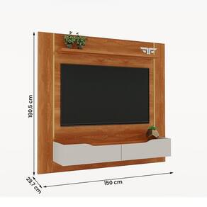 Modelo: Home Suspenso Maracatu; Material da estrutura: MDP 12 mm, 15 mm e 25 mm; Dimensões: 150 cm(L) x 135 cm(A) x 29,7 cm(P); Tamanho máximo de TV: até 70” polegadas; Dimensões do espaço para TV: 164 cm(L) x 115 cm(A); Suporte de TV incluso: Não; Iluminação: Não se aplica; Quantidade de portas: 02 (dobradiças metálicas); Quantidade de Gavetas: Não se aplica; Com puxador: sim, em alumínio; Quantidade de nicho: Não se aplica; Quantidade de prateleira: 01; Peso suportado: até 94 kg distribuídos; Requer montagem: Sim (kit montagem incluso); Embalagem do envio: Papelão e plástico.