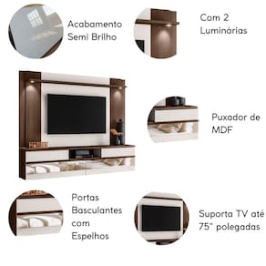 Painel para TV 75 polegadas Design suspenso: mais espaço livre no chão Espelhos decorativos: mais profundidade para o ambiente Iluminação LED: 2 luminárias inclusas 2 portas basculantes com excelente capacidade Puxadores em MDF: toque de elegância Estrutura robusta em MDP com peças de 25mm Acabamento UV semi brilho