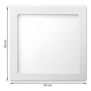 Resumo das caracteristicas e especificacoes: Altura: 4,00 cm, Largura: 30,50 cm, Profundidade: 30,50 cm, Dimensao: 30,5x30,5 cm, Cor da Luz: Branco, Temperatura da Cor: 6500 K, Formato: Quadrado, Potencia: 24 W, Tensao Eletrica: Bivolt, Efeito de Iluminacao: Efeito da Luz Aberto - Ilumina o ambiente de forma igual."