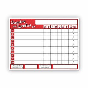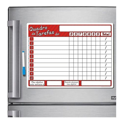 Painel Magnético Quadro De Tarefas Super Nanny Vermelho Os Nossos Imãs para geladeira são impressos com tinta Eco-Solventes com qualidade fotográfica em Vinil Autocolante e depois fixado em uma Manta Magnética com 0,8 mm espessura, ideias para serem fixados em geladeiras. São ideais para quem quer fazer mudanças no ambiente da cozinha de sua casa sem gastar muito, além do seu preço acessível dispensa a contratação de profissionais, já que você mesmo(a) pode fazer a instalação. Painel Magnético Quadro de Tarefas ou incentivo. Medida do painel: 40cm x 30cm. O painel magnético colorido é perfeito para recompensar o bom comportamento das crianças em casa, creches ou escolas. Como utilizar: 1- Relacione as tarefas; 2- Marque se as mesmas foram concluídas ou não; 3- Defina o nº de pontos e a recompensa por semana. Acompanha uma caneta azul com imã e apagador + Recarga Azul Recomendações: Faça a limpeza periódica do seu quadro de tarefas com removedor.
