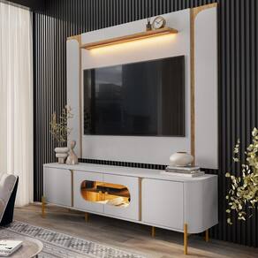 Painel Maresias E Rack Juquehy: estrutura em MDP/MDF com acabamento em pintura UV texturizada. Conjunto composto por prateleiras (MDP 25mm) com LED integrado, portas com dobradiças metálicas (sendo 02 em vidro Reflecta 3mm), passa fios embutido e detalhes usinados com bordas curvas no tampo e base. Conta ainda com puxadores metálicos e pés cilíndricos em aço (ação antiferrugem). Suporta TVs de até 75 polegadas com segurança. Este produto será entregue em 2 volumes.