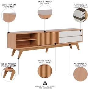 Com design clean, esse painel para vai transformar aquela parede sem graça e com fios aparentes em um espaço de beleza e organização, já que comporta telas de vários tamanhos, com capacidade máxima para 75 polegadas. Já o rack bancada com pés de madeira maciça estilo retrô oferece tanto estabilidade, quanto elegância para a sua sala de estar. Além disso, as duas gavetas com corrediças telescópicas garantem praticidade, enquanto a porta deslizante ripada confere um toque de textura ao móvel. Já a prateleira é ideal para organizar seus aparelhos eletrônicos ou até mesmo objetos decorativos. Para completar a lista de atributos, a base e o tampo de 25mm garantem robustez e durabilidade, tornando essa bancada um investimento de longo prazo.