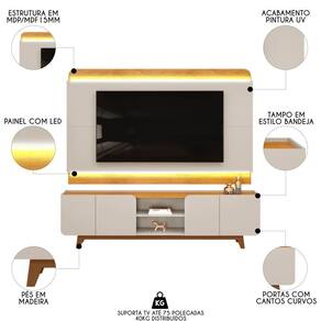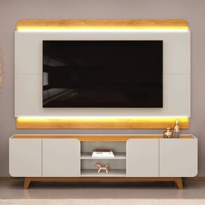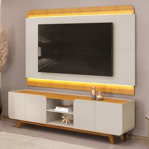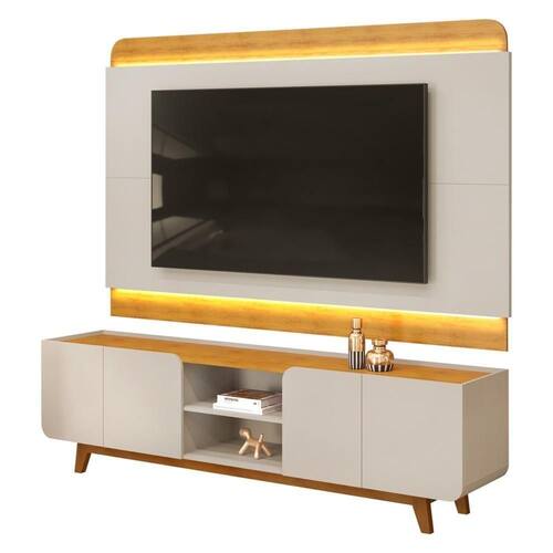 O painel complementa com maestria, exibindo abas e LED superior e inferior que emolduram o espaço da , com a aba superior arredondada adicionando um elemento decorativo sutil. Projetado para suportar até 40Kg, ele é ideal para TVs de até 75, assegurando diversão para toda a família. Com um design inteligente que inclui um tampo recuado em estilo bandeja e laterais que se estendem sobre ele, esta peça é a verdadeira definição de tendência e funcionalidade. Imagine suas noites de filme elevadas a um patamar com esta Bancada para Sala. As quatro portas convencionais com cantos curvos não são apenas estéticas, mas também dispensam o uso de puxadores, elas oferecem amplo espaço para todos os seus objetos essenciais. E para os amantes da tecnologia, há espaços dedicados para seus aparelhos eletrônicos, mantendo tudo organizado e facilmente acessível. Diga adeus à confusão de cabos! Com passa-fios inteligentemente integrados, que mantém a organização descomplicada. E não esqueçamos dos pés em madeira robusta que não só adicionam um charme rústico, mas também facilitam a limpeza e aumentam a durabilidade do seu Rack Bancada. Então, se você valoriza design, funcionalidade e durabilidade, esse conjunto é perfeito para sua casa. Prepare-se para receber elogios!