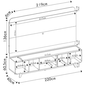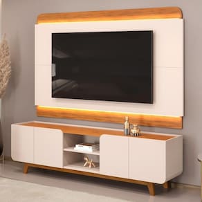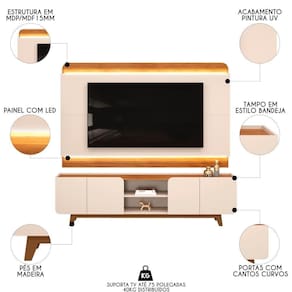 O painel complementa com maestria, exibindo abas e LED superior e inferior que emolduram o espaço da , com a aba superior arredondada adicionando um elemento decorativo sutil. Projetado para suportar até 40Kg, ele é ideal para TVs de até 75, assegurando diversão para toda a família. Com um design inteligente que inclui um tampo recuado em estilo bandeja e laterais que se estendem sobre ele, esta peça é a verdadeira definição de tendência e funcionalidade. Imagine suas noites de filme elevadas a um patamar com esta Bancada para Sala. As quatro portas convencionais com cantos curvos não são apenas estéticas, mas também dispensam o uso de puxadores, elas oferecem amplo espaço para todos os seus objetos essenciais. E para os amantes da tecnologia, há espaços dedicados para seus aparelhos eletrônicos, mantendo tudo organizado e facilmente acessível. Diga adeus à confusão de cabos! Com passa-fios inteligentemente integrados, que mantém a organização descomplicada. E não esqueçamos dos pés em madeira robusta que não só adicionam um charme rústico, mas também facilitam a limpeza e aumentam a durabilidade do seu Rack Bancada. Então, se você valoriza design, funcionalidade e durabilidade, esse conjunto é perfeito para sua casa. Prepare-se para receber elogios!