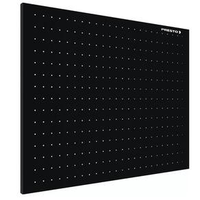 Painel para ferramentas totalmente confeccionado em chapa de aço de baixo teor de carbono com espessura de 0,60mm com sistema de dobra simples na parte superior e inferior e dobras duplas nas laterais. Possui 04 (quatro) furações para instalação nas dobras laterais em formato oblongo para encaixe do painel aos parafusos previamente instalados na parede. 360 (trezentos e sessenta) furações de diâmetro 5.3mm em dispostos 24 (vinte e quatro) linhas verticais de furos em passos de 28mm e 15 (quinze) linhas horizontais de furos em passos de 37mm. Acabamento superficial através de tratamento químico antiferruginoso e fosfatizante com pintura eletrostática a pó com camada mínima de 70 micras. Produto não acompanha ganchos nem parafusos para a fixação.
