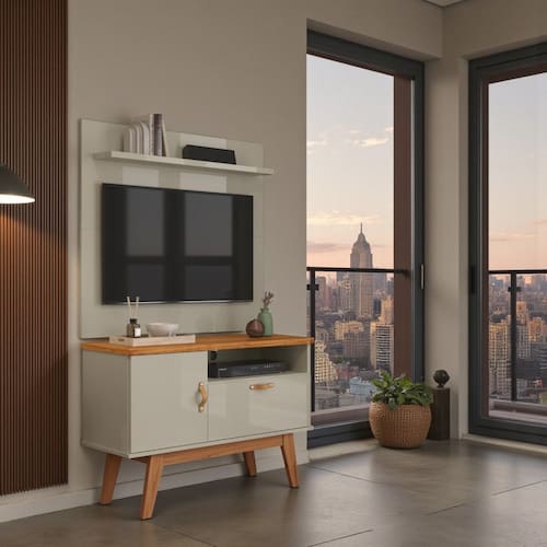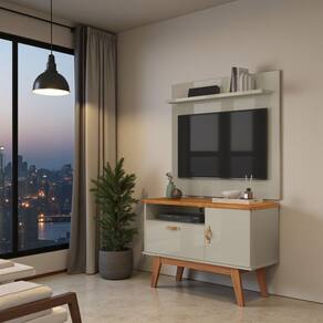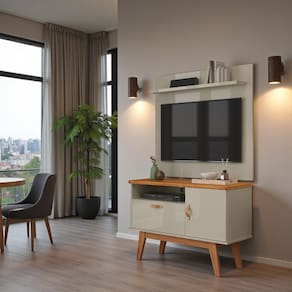 Rack Retrô com Painel Sirius para Sala TV até 32 Polegadas 2 Portas Puxador em Couro Pés em Madeira. Renove sua sala com o Rack com Painel Sirius, ideal para TV até 32 polegadas. Com design retrô moderno, oferece 1 prateleira funcional, 2 portas com puxadores em couro e pés em madeira maciça que garantem charme e resistência. Compacto e elegante, organiza seus aparelhos eletrônicos e decora com sofisticação. - Rack com painel para TV até 32”; - 1 prateleira para eletrônicos e objetos decorativos; - 2 portas com amplo espaço interno; - Puxadores em couro que trazem sofisticação; - Pés em madeira que oferecem durabilidade; - Estilo retrô moderno para sua sala; - Móvel funcional e decorativo; Medidas do Rack: 90 cm (largura) x 67,5 cm (altura) x 38 cm (profundidade); Medidas do Painel: Altura: 90 cm; - Largura: 90 cm;- Profundidade: 18 cm; Este rack retrô com painel para sala é perfeito para quem busca beleza, praticidade e durabilidade em um só móvel. IMAGENS MERAMENTE ILUSTRATIVA.