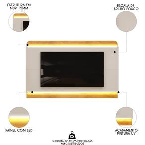 Com duas abas, uma acima e outra abaixo do espaço central destinado à , o design se destaca pela aba superior com cantos curvos, adicionando um charme decorativo ao ambiente. E não para por aí, o Painel de conta com um detalhe em LED que proporciona um toque moderno e acolhedor ao cômodo. Este espaço é amplo o suficiente para acomodar TVs de até 75 polegadas, suportando até 40Kg, o que permite escolher a ideal sem preocupações com o peso. A produção do Painel em MDF e MDP não é só sobre a durabilidade e resistência do móvel, mas também a sustentabilidade, pois ambos os materiais são provenientes de reflorestamento. Isso significa que você pode desfrutar do seu entretenimento favorito enquanto contribui positivamente para o meio ambiente. Além disso, o encontro entre a base e as laterais com cantos curvos reforça o design sofisticado do produto. Com todos esses benefícios, o Painel Suspenso é perfeito para adicionar elegância e conforto à sua casa.
