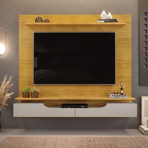Painel Levi, o toque especial para sua casa, com aproveitamento de espaço e aconchego. Estrutura em MDP/MDF (prateleira em MDP, portas em MDF). Móvel compatível com televisores de até 60 polegadas (suporta até 40kg), composta por 2 portas basculantes com limitador metálico e detalhes curvos, 3 nichos, passa-fios e 2 prateleiras com espessura de 25mm (prateleira inferior com detalhes chanfrados assim como seu tampo). Acabamento em pintura UV texturizada fosco e brilho. O produto é entregue em 02 volumes.