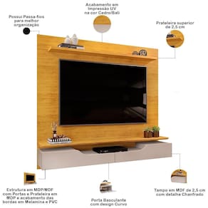 Com um design contemporâneo que se destaca, esse painel suspenso se adapta perfeitamente a ambientes compactos, tornando-se a estrela da sua sala de estar, dormitório ou até mesmo áreas de lazer. Além disso, foi desenvolvido para suportar TVs de até 60 polegadas e com uma impressionante resistência, garantindo que você e sua família desfrutem de momentos incríveis juntos. Prepare-se para maratonas de filmes e jogos emocionantes, sempre com a certeza de que seu painel está à altura do desafio! Já o diferencial está na ampla prateleira superior, ideal para exibir suas peças de decoração favoritas, fotos de família ou até mesmo plantas que trazem vida ao ambiente. E o que dizer do seu tampo chanfrado? Um detalhe que combina delicadeza e sofisticação, elevando o estilo do seu lar a um patamar.