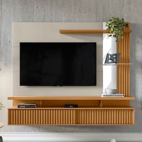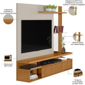 O Painel para TV 60 Pol com Bancada Suspensa 182cm Mogi L05 Nature Off White, da Lyam Decor, é a escolha inteligente para transformar sua sala em um ambiente belo e convidativo. Com design suspenso, esse painel para sala oferece amplo espaço para acomodar sua TV de até 60 polegadas, além de contar om nichos abaixo do tampo, ideais para os demais aparelhos eletrônicos. Além disso, o painel para TV ainda apresenta uma prateleira superior e uma prateleira de vidro para que você exibir suas decorações favoritas e dar aquele toque de único que expresse a sua personalidade. Já as duas portas deslizantes com frentes ripadas adicionam espaço extra para armazenar objetos do dia-a-dia e, assim, manter a organização sobre a bancada suspensa. Ahhh, o espelho e o ripado na lateral do painel garantem modernidade e sofisticação.
