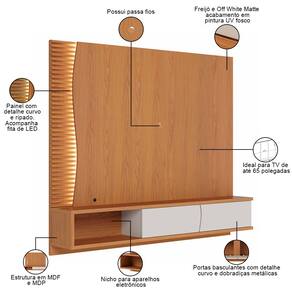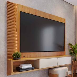 Seu design inovador apresenta um painel ondulado e ripado que traz dinamismo ao ambiente, enquanto as luzes de LED proporcionam um efeito visual acolhedor e sofisticado. Com uma estrutura robusta, o tampo e a base de 25mm garantem a resistência necessária para suportar seu entretenimento, enquanto as portas basculantes com detalhe curvado oferecem um toque de elegância e contribuem para manter o espaço organizado. Em outras palavras, esse painel suspenso foi desenhado para TVs de até 65 polegadas com instalação no painel, ou seja, é a solução perfeita para quem busca unir beleza e praticidade de forma harmônica.