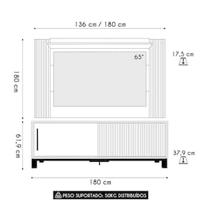 O Painel de TV é uma solução versátil, com medidas ajustáveis de 136cm a 180cm, perfeito para TVs de até 65 polegadas. Seu acabamento microripado, visível nas versões de 150cm e 180cm, traz um toque de sofisticação. Fabricado em MDP, oferece durabilidade e resistência, a prateleira de 25mm proporciona o espaço ideal para exibir objetos decorativos, podendo ser montada na parte superior ou inferior do painel.