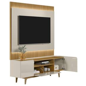 Com um design encantador, o rack para sala com pés de madeira maciça, além de toda a sua funcionalidade, sendo perfeito para a disposição de objetos decorativos e eletrônicos, bem como a organização de diversos itens no compartimento interno, graças as três portas; ainda traz um toque sofisticado para o ambiente, representado nos detalhes, como os cantos arredondados e o tampo rebaixado, que adicionam um toque exclusivo. Para adicionar mais espaço na superfície do móvel, o painel para tv é a opção ideal, já é capaz de suportar televisores de até 70 polegadas, a qual recebe o enfoque da luminária LED que deixa o ar mais acolhedor.