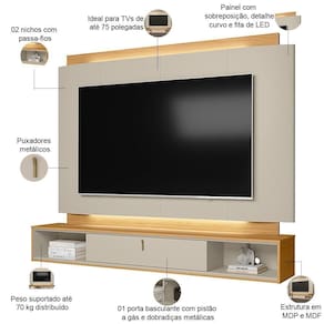 ProductInstructions: Produto para uso em ambiente interno, não devendo ficar exposto diretamente ao sol, calor e umidade | ColorFamily: Carvalho | ColorSimple: Carvalho | SizeDescription: Altura: 163 x Largura: 200 x Profundidade: 33 cm | Material: Estrutura MDPMDF | Com compartimento para alto-falantes: Não | OriginCountry: Brasil | Model: Benny | ColorSupplier: Tauari Off White Fosco | ProductWidth: 200 cm | ProductContents: 01 Painel para TV | SupplierSimpleName: Painel Para TV 75 Pol Bancada Suspensa 200cm LED Benny L05 Tauari Off White Fosco - Lyam Decor | OriginState: PR | Quantidade de portas: 1 | ProductLength: 33 cm | ProductWeight: 61 kg | Profundidade: 33 cm | Color: Tauari Off White Fosco | ProductHeight: 163 cm | MaterialFamily: MDPMDF | Com rodas: Não | ProductWarranty: 90 dias após o recebimento do poduto | Materiais do corpo: MDPMDF | Quantidade de gavetas: 0 | Cor: Tauari Off White Fosco | Peso: 61 kg | Requer montagem: Sim | Tamanho máximo de TV: 75 Polegadas | Largura: 200 cm | Material das corrediças: na | Material da estrutura: MDP | Quantidade de prateleiras: 0 | Altura: 163 cm
