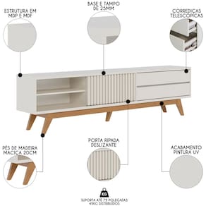 Com design clean, esse painel para tv vai transformar aquela parede sem graça e com fios aparentes em um espaço de beleza e organização, já que comporta telas de vários tamanhos, com capacidade máxima para 75 polegadas. Já o rack bancada com pés de madeira maciça estilo retrô oferece tanto estabilidade, quanto elegância para a sua sala de estar. Além disso, as duas gavetas com corrediças telescópicas garantem praticidade, enquanto a porta deslizante ripada confere um toque de textura ao móvel. Já a prateleira é ideal para organizar seus aparelhos eletrônicos ou até mesmo objetos decorativos. Para completar a lista de atributos, a base e o tampo de 25mm garantem robustez e durabilidade, tornando essa bancada um investimento de longo prazo.