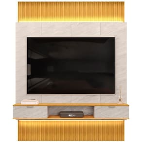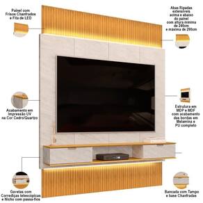 Não sabe qual móvel escolher para compor a sala de estar pequena? Com o Painel Para 75 Pol com Bancada Suspensa e LED Bit, da Lyam Decor, você encontra a solução compacta e elegante para a decoração e do seu ambiente. Cada detalhe foi projetado para oferecer a melhor experiência que você possa ter, a começar pela bancada suspensa dividida em três partes, sendo duas gavetas para guardar diversos objetos e um nicho para instalar aparelhos eletrônicos, garantindo máximo de funcionalidade enquanto aproveita seu entretenimento favorito. Já o painel para possui bordas chanfradas e fita de LED, os quais adicionam um toque decorativo e emolduram o amplo espaço para telas de até 75 polegadas. Além disso, as partes ripadas acima e abaixo do painel são extensíveis, adaptando-se perfeitamente à parede do piso ao teto, de acordo com a sua necessidade, proporcionando uma estética elegante e com acabamento sofisticado. Demais não é mesmo?! Então, comece hoje a transformar sua casa em um ambiente acolhedor com o Painel Bit.