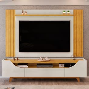 As laterais curvas ripadas do Rack para , com o tampo e a base com cantos curvos criam uma harmonia visual incrível. E as bordas chanfradas? Elas adicionam aquele toque de classe ao móvel. Com duas portas deslizantes e ripadas, você terá espaço de sobra para organizar tudo o que precisa, e as portas ripadas dispensam o uso de puxador deixando ainda mais elegante. Ele tem espaço para aparelhos eletrônicos no tampo, junto com a prateleira de vidro, e conta também com passa-fios inteligentes para manter tudo em ordem. Os pés metálicos cilíndricos na cor dourada adicionam um brilho especial, e facilitam a limpeza e aumentam a durabilidade da bancada. O Painel Suspenso com cantos arredondados e divisões com bordas chanfradas, cria um cenário perfeito para TVs de até 75 polegadas. E os perfis de LED traz sofisticação e modernidade ao conjunto. E o melhor de tudo? Tanto a Bancada quanto o Painel são produzidos 100% em MDF, garantindo que sua escolha seja de qualidade. A sala dos sonhos precisa desse conjunto.