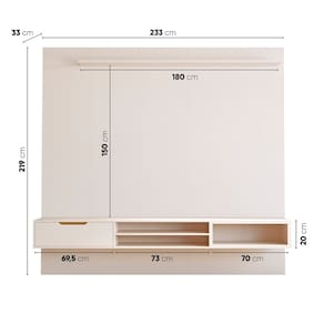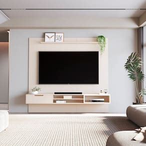 Um painel para TV com nichos e prateleira superior, ideal para organizar e valorizar sua sala. Ele serve para acomodar a televisão, aparelhos eletrônicos e objetos decorativos, deixando o ambiente funcional e elegante. Pode ser utilizado na sala de estar, quarto ou área de lazer. Combina com móveis modernos, cores neutras, plantas, luminárias, mesas de centro e itens decorativos minimalistas, criando um espaço sofisticado e bem organizado. Imagem com decoração ilustrativa. Produto Montado: Sim Acabamento: Pintura UV Acabamento da Gaveta: Pintura UV Acabamento da Prateleira: Pintura UV Ambiente Principal: Sala de Estar codigo_ean: 7900288289391 Complexidade da Montagem: Média: pode ser montado por mais de uma pessoa e/ou necessite de maior conhecimento para montagem Cor: Off White Cor da Prateleira: Bege Cor do Produto: Off White Cor Flex: não Cor Interna: Off White Escala de Brilho: Semi-Brilho Escala de Brilho da Gaveta: Semi-Brilho Escala de Brilho da Prateleira: Semi-Brilho Espessura do Painel: 1,5 cm Fixação na Parede: Sim Gaveta com Chave: Não Ideal para TVs até (Polegadas): 84 Itens Inclusos: 1 Painel, Kit Ferragens e Manual de Montagem. Linha ou Coleção: Plus Manual de Especificação Técnica: https://product-hub-prd.madeiramadeira.com.br/839185781/documents/1e6b3042-833d-40bc-a7e6-9d1b5a44d61b3333220540417643514869386.pdf Manual de Montagem e Instalação: https://product-hub-prd.madeiramadeira.com.br/839185781/documents/3fa81e66-5643-4ef1-9c17-231e4ae53ab13333219540417643514671618.pdf Marca: JB Bechara Material da Gaveta: MDF Material da Prateleira: MDF Material Principal: MDF Montagem Flex: não Necessita Montagem: Sim Origem do Produto: Nacional Peso: 101,5 kg Peso Máximo por Gaveta: 2 kg Peso Máximo por Prateleira: 2 kg Possui Espelho: Não Possui iluminação: Não Possui Passa Cabos: Sim Possui Pés: Suspenso Possui Portas: Não Possui Prateleiras: Sim Possui Tomada: Não Possui Vidro: Não Quantidade de Gavetas: 01 Gaveta Quantidade de Nichos: 03 Recomendações de Uso, Manutenção e Limpeza: Na remoção da poeira utilize flanela limpa e levemente umedecida. Não exponha à luz solar e locais úmidos. Não encoste o móvel na parede para evitar transmissão de umidade. Sapatas Niveladoras: Não Sistema de Montagem: O produto será entregue desmontado, acompanhado do manual de montagem. Não oferecemos serviço de montagem. A montagem e instalação é por conta do cliente. Recomendamos a contratação de um profissional. Não nos responsabilizamos por danos decorrentes a e Suporte de TV Universal Incluso: Não Tipo de Corrediça da Gaveta: Metálica Telescópica Tipo de Puxador da Gaveta: Embutido