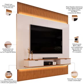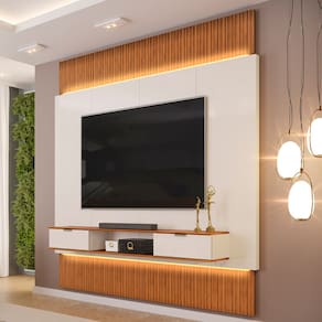 Não sabe qual móvel escolher para compor a sala de estar pequena? Com o Painel Para TV 85 Pol com Bancada Suspensa e LED Bit, da Lyam Decor, você encontra a solução compacta e elegante para a decoração e do seu ambiente. Cada detalhe foi projetado para oferecer a melhor experiência que você possa ter, a começar pela bancada suspensa dividida em três partes, sendo duas gavetas para guardar diversos objetos e um nicho para instalar aparelhos eletrônicos, garantindo máximo de funcionalidade enquanto aproveita seu entretenimento favorito. Já o painel para TV possui bordas chanfradas e fita de LED, os quais adicionam um toque decorativo e emolduram o amplo espaço para telas de até 85 polegadas. Além disso, as partes ripadas acima e abaixo do painel são extensíveis, adaptando-se perfeitamente à parede do piso ao teto, de acordo com a sua necessidade, proporcionando uma estética elegante e com acabamento sofisticado. Demais não é mesmo?! Então, comece hoje a transformar sua casa em um ambiente acolhedor com o Painel Bit.