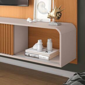 Eleve o nível da sua sala de estar com a Painel Para 85 Pol com Bancada Suspensa e LED Zurick B01 Cinamomo Off White, da Lyam Decor. Com um design imponente e projetado para receber TVs de até 85 polegadas, esse painel home proporciona uma experiência cinematográfica envolvente, além de criar um ambiente convidativo. A iluminação de LED e os apliques canelados nas laterais garantem um toque sofisticado e contemporâneo, ao passo que a bancada com cantos arredondados e os detalhes canelados adicionam um charme elegante.