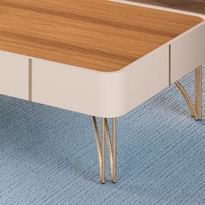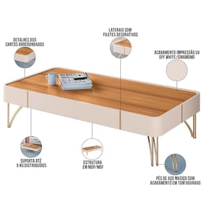 Já a mesa de centro não é diferente e o design orgânico agrega ainda mais beleza, graças aos detalhes expressos desde os filetes decorativos nas laterais, os cantos arredondados até os pés de aço maciço com acabamento dourado. Em outras palavras, a harmonia desse conjunto de painel para e mesa de centro será o ponto alto da sua sala de estar.