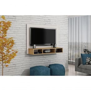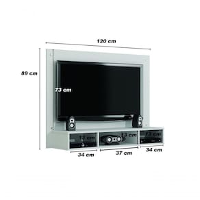 Dimensões: Largura: 1200 mm Altura: 890 mm Prof.: 310 mm Peso: 20,500 kg Cubagem: 0,049 m3 Volumes: 1 caixa Espaço para TV: TV LCD e LED até 46? suspenso Espaço para TV (pendurada) 1200x730 mm (LxA) Espaço para equipamentos eletrônicos: Espaço para aparelhos 1100x280mm (LxP) Acompanha suporte para TV