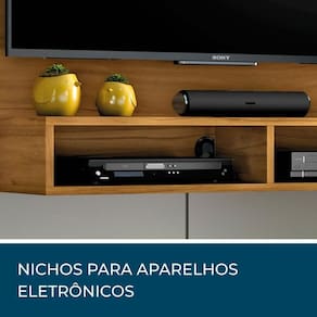 O Painel Eros é para TV de até 49 polegadas. Um móvel para ambientes menores, uma forma de trazer mais funcionalidade ao quarto, sala ou escritório e mesmo assim, deixando o espaço otimizado. Na sua base há 2 nichos para acomodar os aparelhos eletrônicos. O acabamento é em BP, um processo de finalização da peça bastante resistente, principalmente a riscos, ou seja, você terá esse móvel novinho, por muito tempo.