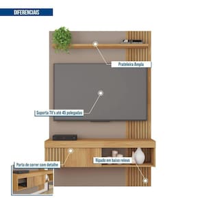 O Painel Safira é desenvolvido com estrutura MDP/MDF, remetendo muita elegância ao ambiente. Possui detalhes em frisos decorativos, prateleira superior, nicho espaçoso com divisão interna e espaço no tampo, garantindo lugar para os eletrônicos e objetos de decoração. Produto Montado: Sim Acabamento: Pintura UV Acabamento da Porta: Pintura UV Acabamento da Prateleira: Pintura UV Ambiente Principal: Sala de Estar codigo_ean: 7909903478134 Complexidade da Montagem: Média: pode ser montado por mais de uma pessoa e/ou necessite de maior conhecimento para montagem Cor: Buriti/Cinza Cor do Produto: Buriti/Cinza Cor Flex: Não Cor Interna: Buriti Escala de Brilho: Fosco Escala de Brilho da Porta: Fosco Escala de Brilho da Prateleira: Fosco Ideal para TVs até (Polegadas): 55 Itens Inclusos: 1 Painel Kit Ferragens Manual de Instrução Manual de Especificação Técnica: https://product-hub-prd.madeiramadeira.com.br/875921/documents/22238dca-d913-4b5c-8ae7-d011e4fb6c601648388ftpaineljade12.pdf Manual de Montagem e Instalação: https://product-hub-prd.madeiramadeira.com.br/875921/documents/d1b98f62-fa01-481c-a9bd-87255a0749161648387eqpaineljade12.pdf Material da Porta: MDF Material da Prateleira: MDP Material do Puxador da Porta: MDF Material Principal: MDF/MDP Montagem Flex: Não Necessita Montagem: Sim Origem do Produto: Nacional Peso: 35,9 kg Peso Máximo por Prateleira: 3 kg Possui Espelho: Não Possui iluminação: Não Possui Passa Cabos: Sim Possui Pés: Suspenso Possui Portas: Sim Possui Prateleiras: Sim Possui Tomada: Não Possui Vidro: Não Quantidade de Nichos: 01 Recomendações de Uso, Manutenção e Limpeza: Limpar com pano macio levemente umedecido e em seguida pano macio seco. Não utilizar produtos abrasivos (lixas, esponjas) e/ou produtos a base de solventes (thinner, aguarrás). Sapatas Niveladoras: Não Sistema de Montagem: Utiliza-se na montagem do produto sistema de fixação minifix, dobradiças, dispositivos angulares, cavilhas, parafusos, porcas cilindricas, entre outros; Suporte de TV Universal Incluso: Não Tipo de Puxador da Porta: Embutido