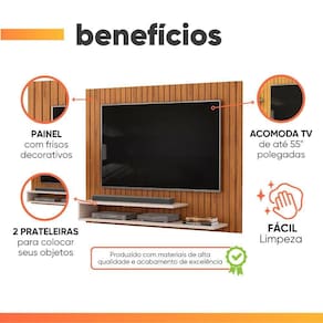 Importante sobre a entrega: A entrega é realizada até a portaria ou porta de entrada do endereço indicado, desde que o acesso seja permitido. Para locais com portaria, a entrega será feita no piso térreo. Não realizamos montagem, desmontagem, transporte por escadas ou içamento. É responsabilidade do cliente verificar se as dimensões do produto são compatíveis com portas, elevadores e corredores. Evite imprevistos: confira todos os detalhes antes de concluir sua compra. MEDIDAS PAINEL:: A = 108 cm L = 134,5 cm P = 28 cm | MEDIDAS PRATELEIRAS:: L = 106,3 cm inf / 82,5 cm sup P = 25,4 cm | PESO SUPORTADO:: 40 kg | PESO:: 20,90 kg | PRATELEIRAS SUPORTAM ATÉ:: 5 e 10 kg | IDEAL PARA TV DE ATÉ:: 55 Polegadas | MODELO:: Painel Para TV Até 55 Polegadas Detalhe Frisado Com Prateleiras Hope | MARCA:: DJ Móveis | PINTURA:: UV de alta qualidade | ACABAMENTO:: Melamina | MATERIAL:: MDP/MDF | ESPESSURA DO MATERIAL DA ESTRUTURA:: 15 mm | PRATELEIRAS:: 2 | ESPAÇO PARA PASSAR FIOS:: Sim | DIFERENCIAL:: Acabamento pintura UV de alta qualidade / Detalhe frisado autêntico / Prateleiras para itens de uso diário / Para TVs até 55 Polegadas. | INSTRUÇÕES E CUIDADOS:: Para maior durabilidade, recomendável que a limpeza dos móveis seja feita com pano limpo e seco. Não usar produtos químicos ou abrasivos. | GARANTIA:: 3 meses pelo fabricante. | AVISO:: Importante sobre a entrega: A entrega é realizada até a portaria ou porta de entrada do endereço indicado, desde que o acesso seja permitido. Para locais com portaria, a entrega será feita no piso térreo. | Altura: 108 cm | Formato do móvel: Painel | Inclui manual de montagem: Sim | Largura: 134,5 cm | Profundidade: 28 cm | Quantidade de caixas de embalagem: 1 | Requer montagem: Sim | Altura da embalagem: 8 cm | Comprimento da embalagem: 110 cm | Largura da embalagem: 45 cm | Peso da embalagem: 20900 g | Tipo da embalagem: sem embalagem adicional | Cor: Madeirado/Off White