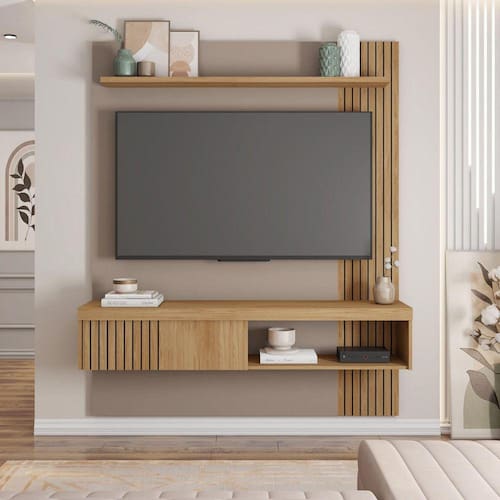 O Painel Jade é desenvolvido com estrutura MDP/MDF, remetendo muita elegância ao ambiente. Possui detalhes em frisos decorativos, prateleira superior, nicho espaçoso com divisão interna e espaço no tampo, garantindo lugar para os eletrônicos e objetos de decoração. Acabamento: Pintura UV Acabamento da Gaveta: Acabamento da Porta: Pintura UV Acabamento da Prateleira: Pintura UV Acabamento dos Pés: Acompanha Lâmpada: Altura do Espelho: Altura do Espelho 01: Altura do Espelho 02: Altura do Espelho 03: Altura do Espelho 04: Altura do Espelho 05: Altura do Espelho 06: Altura dos Pés: Ambiente Principal: Sala de Estar Complexidade da Montagem: Média: pode ser montado por mais de uma pessoa e/ou necessite de maior conhecimento para montagem Cor: Buriti/Cinza Cor do Produto: Buriti/Cinza Cor Flex: Cor Interna: Escala de Brilho: Fosco Escala de Brilho da Gaveta: Escala de Brilho da Porta: Fosco Escala de Brilho da Prateleira: Fosco Espessura do Espelho: Espessura do Vidro: Fita Integrada: Formato do Espelho: Gaveta com Chave: Ideal para TVs até (Polegadas): 55 Informações Complementares: Itens Inclusos: 1 Painel, Kit de Ferragens e Manual de Montagem Largura do Espelho: Largura do Espelho 01: Largura do Espelho 02: Largura do Espelho 03: Largura do Espelho 04: Largura do Espelho 05: Largura do Espelho 06: Linha ou Coleção: Manual de Especificação Técnica: Manual de Montagem e Instalação: https://cdn2.madeiramadeira.com.br/atributo/caemmun-moveis/1177703-esquema-painel-jade-1-8.pdf Material da Gaveta: Material da Porta: MDP Material da Prateleira: MDP Material do Puxador da Gaveta: Material do Puxador da Porta: Material dos Pés: Material Principal: MDP Montagem Flex: Não Necessita Montagem: Sim Origem do Produto: Nacional Peso: 43.25 Peso Máximo por Gaveta: Peso Máximo por Prateleira: 5 Possui Espelho: Não Possui iluminação: Não Possui Pés: Suspenso Possui Portas: 01 Possui Prateleiras: 02 Possui Tomada: Não Possui Vidro: Não Quantidade de Espelho: Quantidade de Nichos: 01 Recomendações de Uso, Manutenção e Limpeza: Limpar com pano macio, seco ou úmido, sem uso de produtos abrasivos. Pois, podem trazer danos ao produto. Rodízio com Trava: Sapatas Niveladoras: Não Sistema de Montagem: Minifix, Cavilhas e Parafusos Suporte de TV Universal Incluso: Não Tipo de Corrediça da Gaveta: Tipo de Dobradiça/Corrediça da Porta: Tipo de Fixação do Espelho: Tipo de Madeira Maciça: Tipo de Madeira Maciça da Gaveta: Tipo de Madeira Maciça da Porta: Tipo de Madeira Maciça da Prateleira: Tipo de Madeira Maciça do Puxador da Gaveta: Tipo de Madeira Maciça do Puxador da Porta: Tipo de Madeira Maciça dos Pés: Tipo de Porta: Correr Tipo de Puxador da Gaveta: Tipo de Puxador da Porta: Embutido