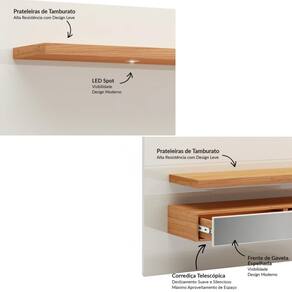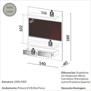 Características: Estrutura 100% MDF Acabamento em Pintura UV Necessita de Fixação na Parede 02 Gavetas Espelhadas com Corrediças Telescópicas 02 Prateleiras Leve e Resistente 02 LED's na Prateleira Superior Ideal para TV até 60 Polegadas
