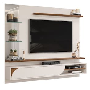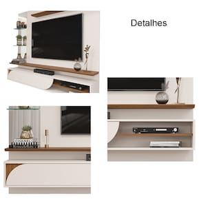 Características: Estrutura em MDF e MDP Acabamento UV Prateleiras Chanfradas Porta Basculante Curva Torre de Espelhos com 2 prateleiras de Vidro Suporta: Painel 40 kg e Base 5 kg Ideal para TV até 60 Polegadas