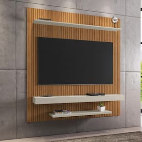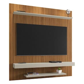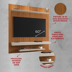 - Produzido em MDP (12/15mm) com pintura UV: alta durabilidade e resistência. - Suporta TV de até 60 polegadas (até 25kg) fixada no painel. - Prateleira inferior (25mm), tampo e prateleira superior: amplo espaço para acomodação de aparelhos eletrônicos, livros e itens decorativos. - Espaço para passagem de fios: cabos organizados e ambiente livre de bagunça.