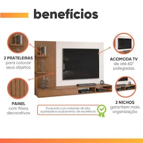 DIFERENCIAL: Painel espaçoso / Acabamento pintura UV de alta qualidade / Detalhe frisado autêntico / Prateleiras funcionais / 03 Nichos para melhor armazenamento / Porta deslizante / Para TV's até 60 Polegadas.