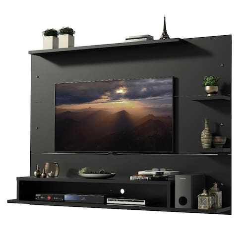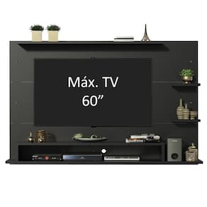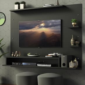 Com capacidade para TV até 60 polegadas, o painel conta com uma prateleira grande na parte superior e duas prateleiras menores na lateral, com ótima espessura. Assim, há espaço de sobra para a disposição dos itens decorativos.