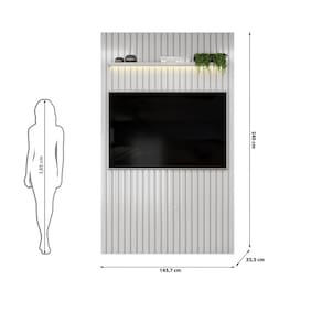 complementar, o painel conta com uma prateleira robusta de 25cm de espessura com borda chanfrada, ideal para valorizar