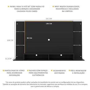 Dimensões do produto montado: Altura: 108 cm | Largura: 191 cm | Profundidade: 31,5 cm Tamanho Painel TV: 136 x 90cm *Devido as variações de tamanho dos televisores no mercado, sugerimos que verifique as medidas da sua TV e compare com o painel antes de efetuar a compra. *Não recomendamos utilizar suporte de TV articulado. *Você pode consultar as medidas internas na imagem técnica do produto.