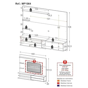 Dimensões do produto montado: Altura: 141,5cm | Largura: 180cm | Profundidade: 30cm Tamanho Painel TV: 151 x 93cm *Devido as variações de tamanho dos televisores no mercado, sugerimos que verifique as medidas da sua TV e compare com o painel antes de efetuar a compra.